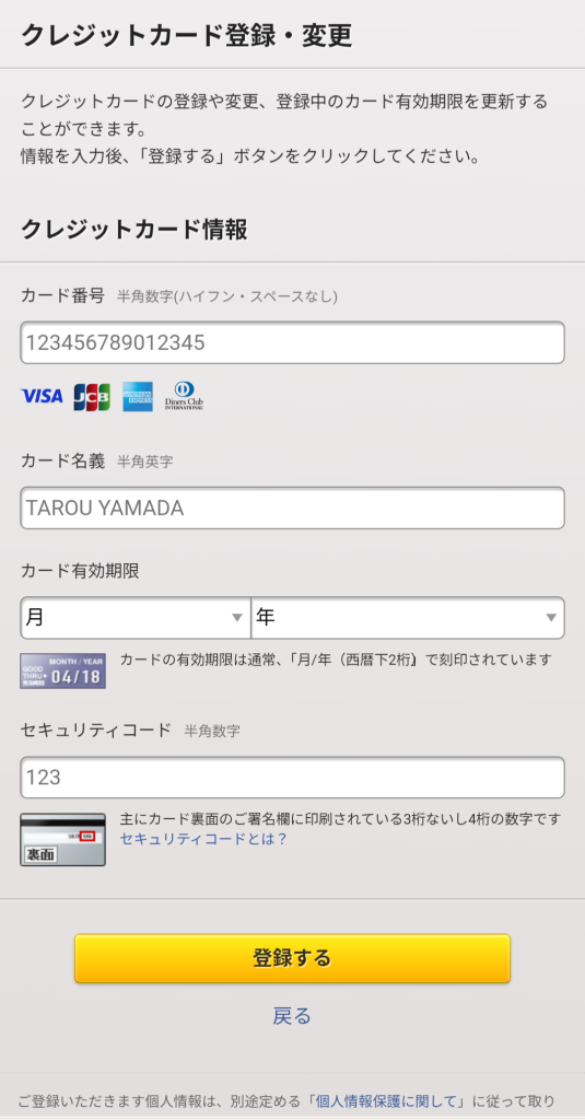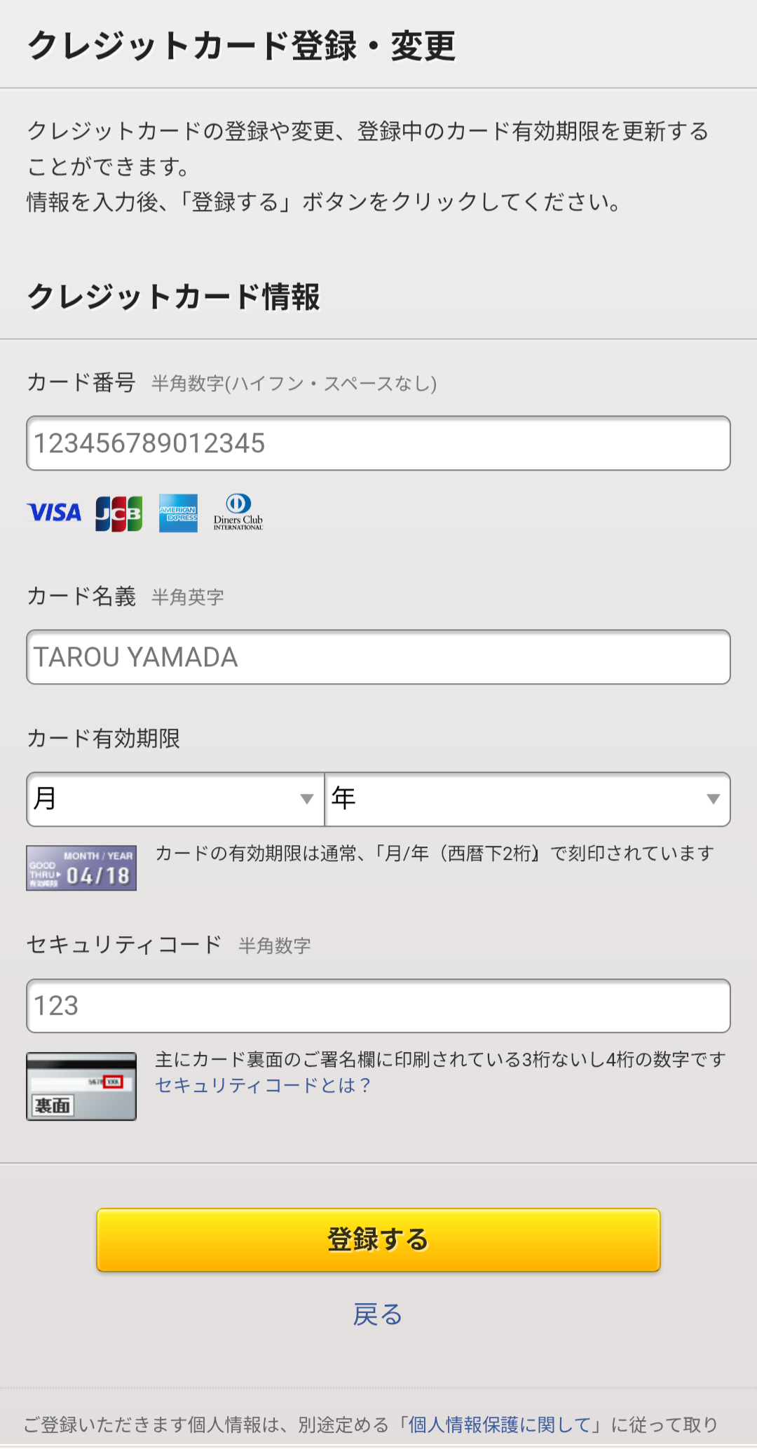 登録ページが表示されたら、カード番号・カード名義・カード有効期限・セキュリティコードを正確に入力してください。