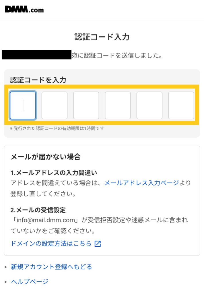 「認証コードを入力」ページが表示されたら、「会員登録認証コードのお知らせ」メールに書かれている6ケタの数字を入力します。