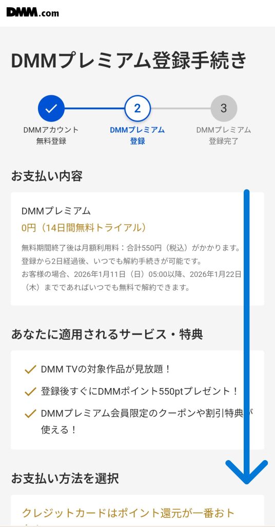 DMMプレミアムの登録手続きページに切り替わったら、「お支払い方法を選択」のところまで画面をスクロールします。