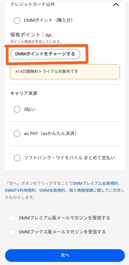 ポイントのチャージが完了したら、支払い方法で「DMMポイント(購入分)」にチェックを入れて登録します。