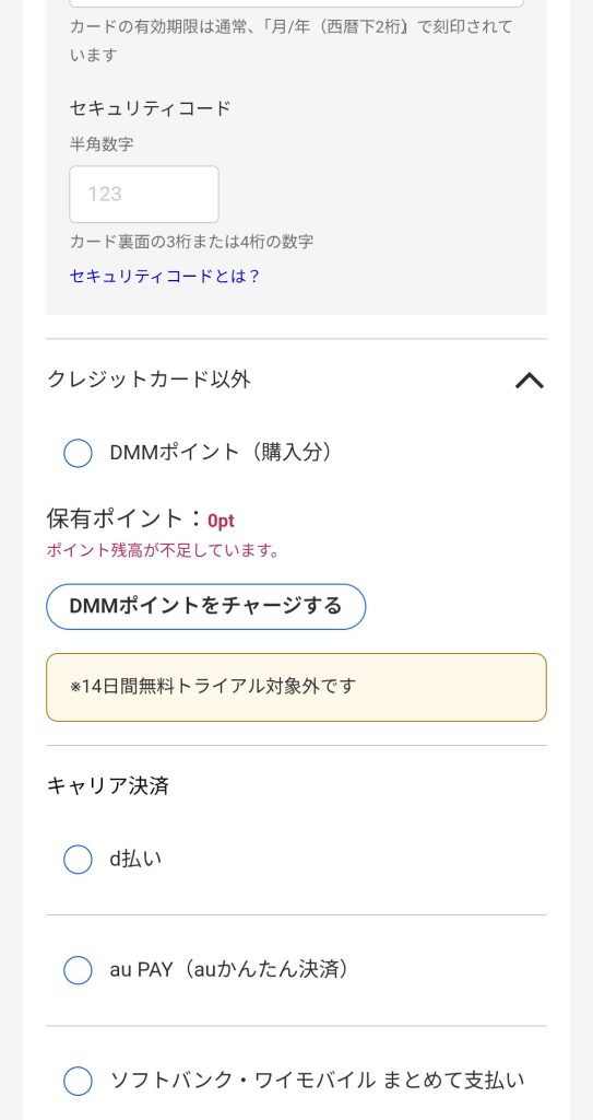 無料トライアルを申し込む場合は、クレジットカード、キャリア決済のいずれかから選びましょう。
