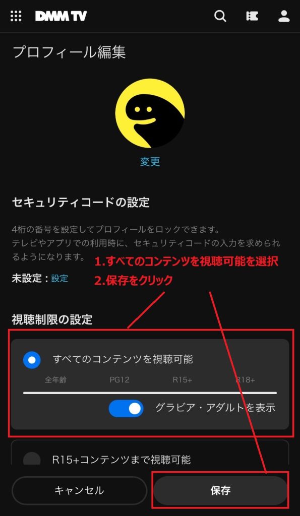 視聴制限の設定画面で「すべてのコンテンツを視聴可能」にチェックを入れ、保存をクリックします。