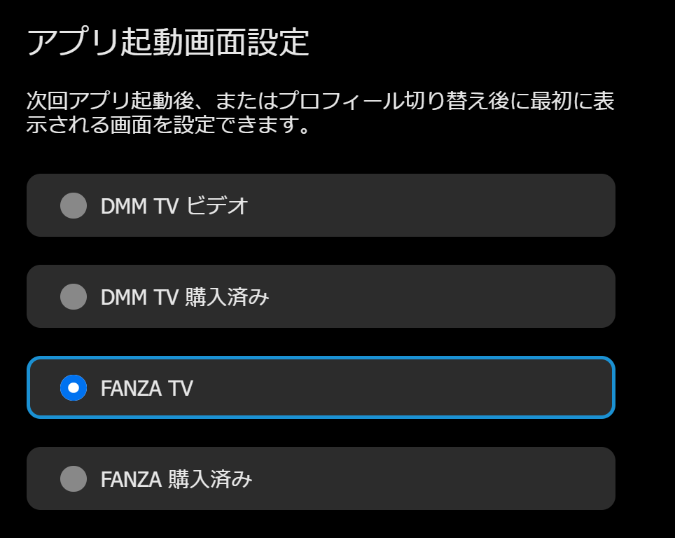 - アプリ起動時画面設定を「FANZA TV」または「FANZA購入済み」に設定
