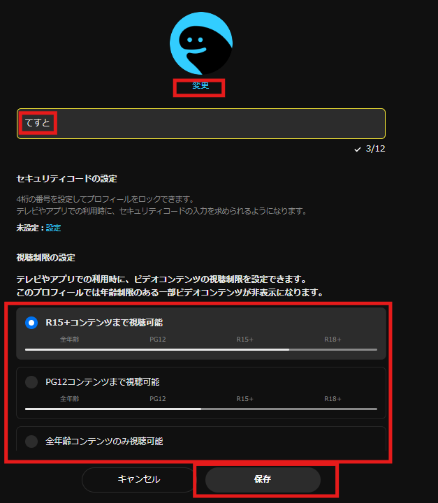 新規プロフィール作成時、「視聴制限をかける」にチェック
